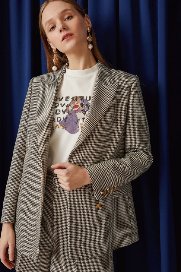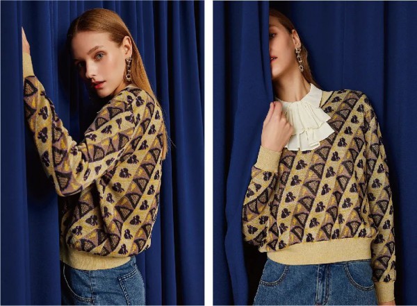 纯洁的内心需要柔软呵护,柔软的针织也需要找到自己的灵魂,彩葱交织的针织质感细腻,亲肤柔软,轻复古色调配色,点缀流行紫色,复古几何图案与美女与野兽的剪影图案融合。