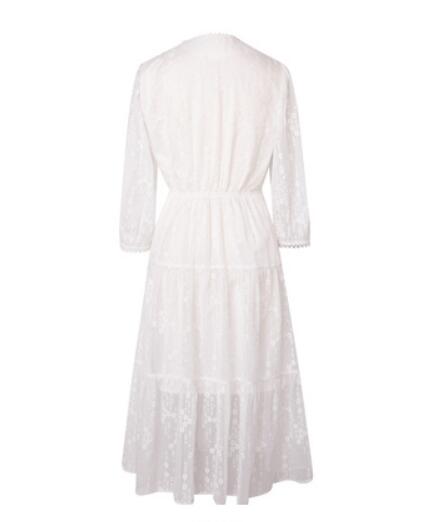 迪赛尼斯2020夏装新款高腰白色雪纺连衣裙,这款连衣裙是迪赛尼斯今年夏季线上主打的连衣裙产品之一,该连衣裙采用了轻奢刺绣雪纺绉面料,该面料多运用在婚纱礼服,耗费数万针高密度丝线,绣制而成,表面自然肌理感与微透效果结合,重工轻奢,整体通透性强,穿着不闷,触感柔软不僵硬,能保持自然垂感,且有较强耐皱性,这正是夏季广大爱美女性对于轻薄、透气轻奢的着装要求。