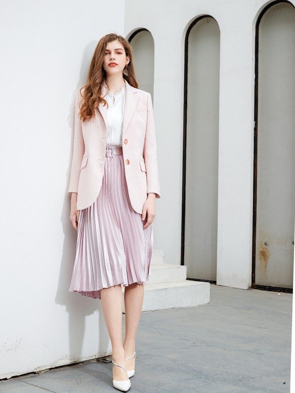 这款浅色系列的搭配看起来很是温柔,粉色西装外套将女性的温柔与知性展现出来,翻领的设计简约大方,内搭一件白色衬衣,衣领的设计将女性的优雅与浪漫完美的展现出来,下身搭配一件淡紫色的半身裙,百褶裙的设计看起来很是好看,高腰的设计轻松穿出自己的大长腿,搭配一双高跟鞋,整体的造型看起来很是优雅温柔。