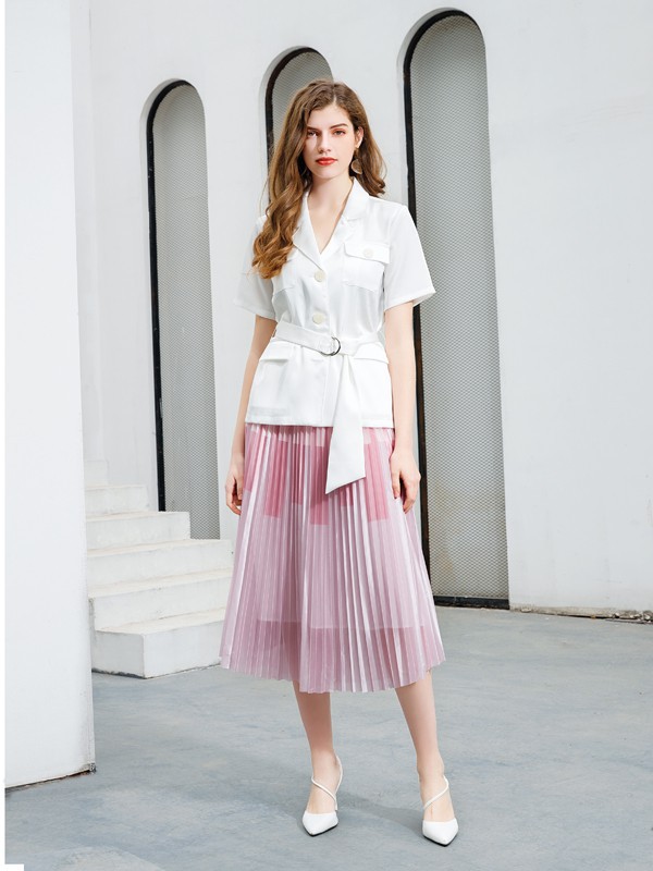 这款穿搭看起来简约许多,带给人截然不同的感觉,上身是一款短袖衬衣的设计,翻领搭配V领的设计不仅将自己的性感的锁骨展现出来,而且还很显气质,腰间收腰的设计轻松穿出自己的小蛮腰,下身搭配一件粉色百褶裙,半身裙的设计也很是好看,裙摆的长度露出性感的腿部,白色搭配粉色也很是好看的,搭配一双高跟鞋,整体的造型简约优雅。