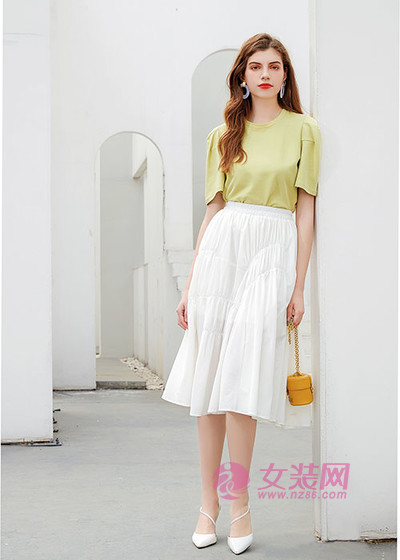 这件草绿色T恤,单看颜色蛮高级的,但可能不大衬肤色,下身搭配的白裙子也是同样功效,在搭配时加入纯白色的单品,可以让造型更加的平衡。