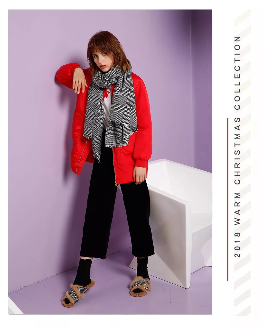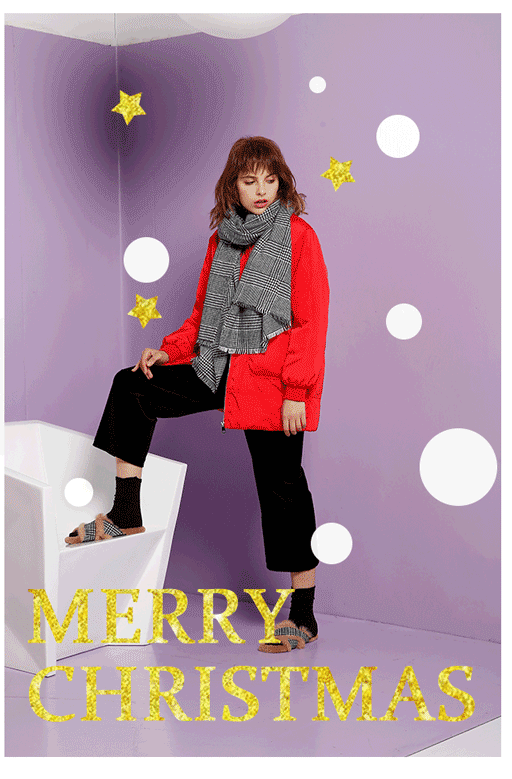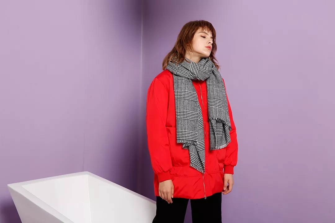 红色系羽绒服,新颖别致,下搭简单的牛仔或阔腿裤,红黑典组色,组出不一样的风景。