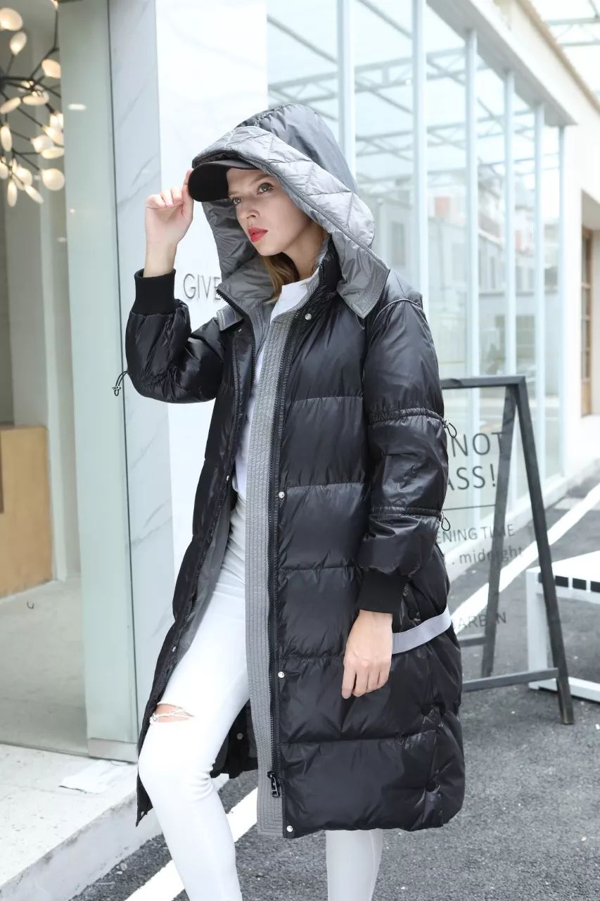 超长加厚羽绒服+白色T恤+白色紧身裤+白色板鞋