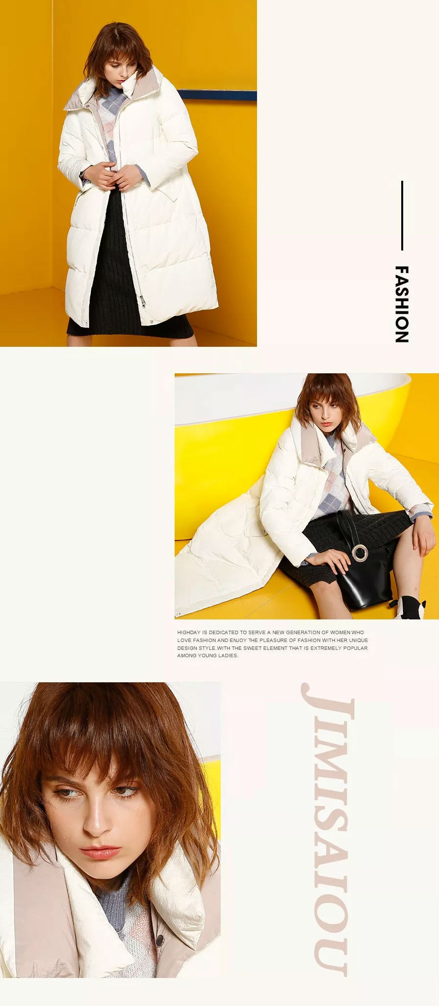 刚好到膝盖的羽绒服,建议穿高跟鞋来搭配,同时要记得上宽下窄的原则。选择膝盖下方一点点,在小腿中部以上的长度是***比例。