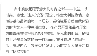 “吉米赛欧”女装主要采用棉、锦、涤、丝等天然进口面料和一些新兴的高科技面料,注重色彩协调与搭配、版型的变化与创新。以人体工程学为设计出发点,注重高级材质面料的运用,以理性、精致、低调表现现代职业女性风格,塑造简约独立、优雅内敛的高品质生活态吉米赛欧度的jimiSaiou女性形象。