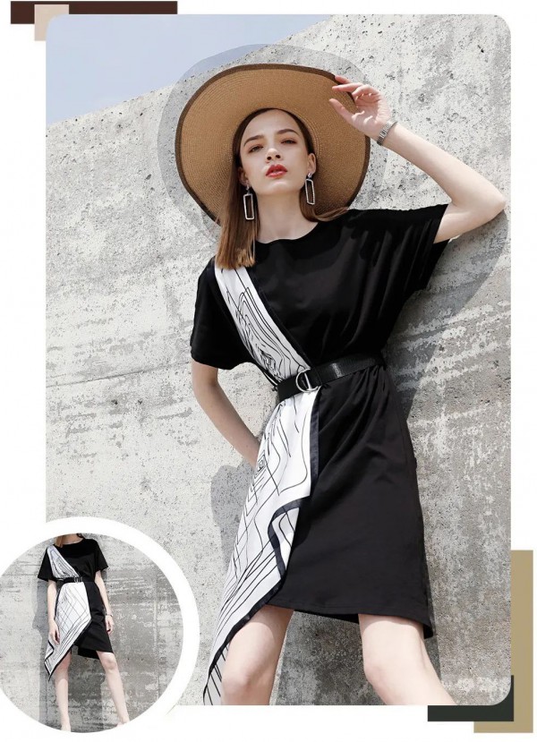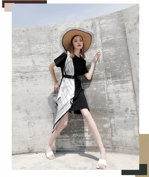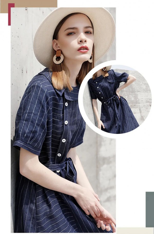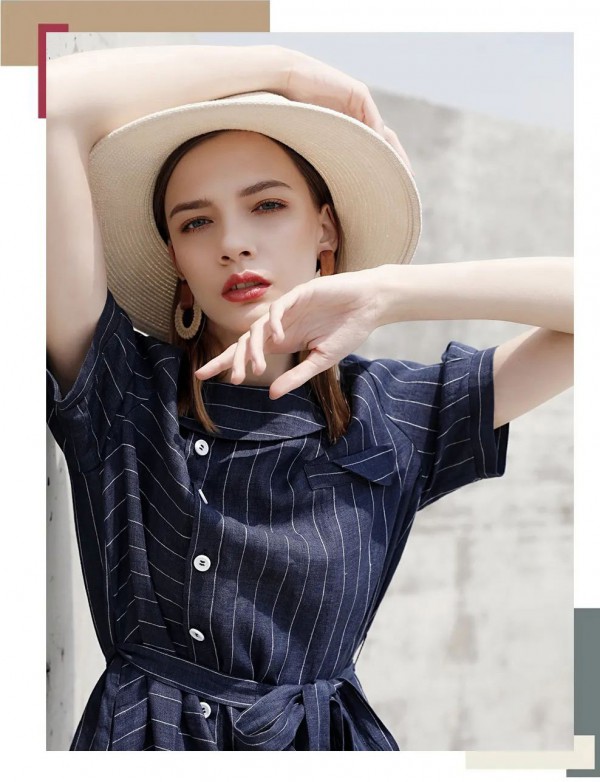条纹元素永远不会过时,它是意法慵懒风的经典元素标志,艳度上加以区分,做成了拼接撞色的独特复古感,微微收腰提高腰线、下身竖条纹拉长视觉线条、让整条裙子增添了造型感
