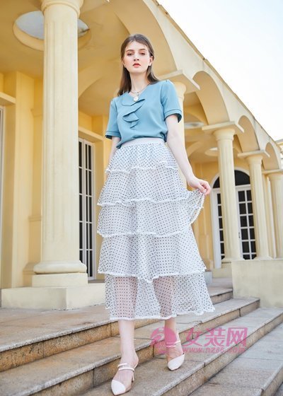 高级感满满的蓝色雪纺衬衫,宽松较为的宽松,即使是身上有肉的妹子也可以穿。荷叶边的加入设计,温和而又美丽,还不显一点拘束感。下身搭配一条波点半身裙穿着,舒适自在又显得街拍范满溢。