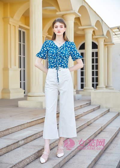 阔腿裤是夏天比较常见的裤型,宽松的裤腿可以遮挡腿部的赘肉,拉长腿部线条。白色的裤子能够给人一种十分清新的感觉,搭配一件蓝色波点短款上衣,温柔又精致。