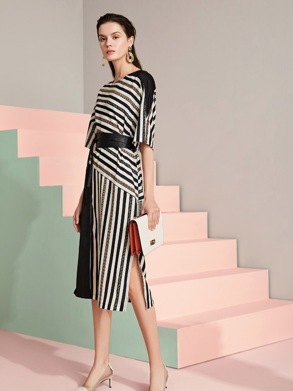 条纹的元素在今年还是很流行的,这款条纹套装的设计还是很好看哦,圆领的设计将自己迷人的脖颈曲线显示出来,黑白色的搭配经典大方,腰间搭配一条黑色腰带,将自己性感的腰身束出来,裙摆处开叉的设计很有小心机哦,看起来性感极了,搭配一双高跟鞋,整体的气质高挑大方。