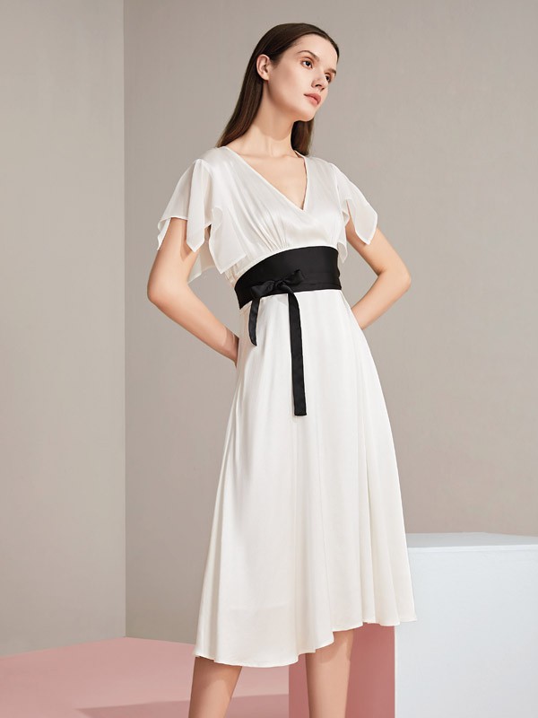 近年流行的法式穿搭,乔帛JAOBOO女装这款深V设计白色连衣裙也是相当美致,深V设计胸部露肤恰到好处,没有特别的媚俗,但却有法式风情应有的优雅,搭配黑色腰带,腰线分明,凸显身材比例。