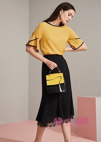 半身裙是职场女性衣橱里面必不可少的一件单品,对于职场女生来说并不适合太过花哨或者是风格太过活泼的半身裙,但是职场包臀裙又太过于死板,所以这种纯色蕾丝边半身裙就非常合适,纯色的款式穿在身上十分稳重大气。搭配黄色上衣,看起来非常高级。