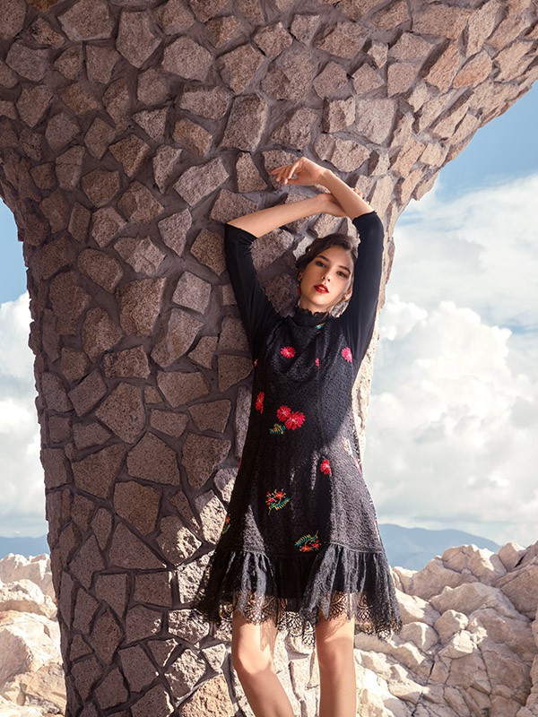 这款黑色连衣裙充满了民族风的搭配很适合秋季穿,衣领处花边的设计,彰显出优雅浪漫的女人味,修身的版型将自己的完美身材曲线展现出来,刺绣的花朵设计看起来温婉有大气,黑色的颜色不仅显瘦还很显气质,裙摆的设计搭配蕾丝,露出性感性感的腿部曲线,搭配一双高跟鞋,整体的造型简约优雅。