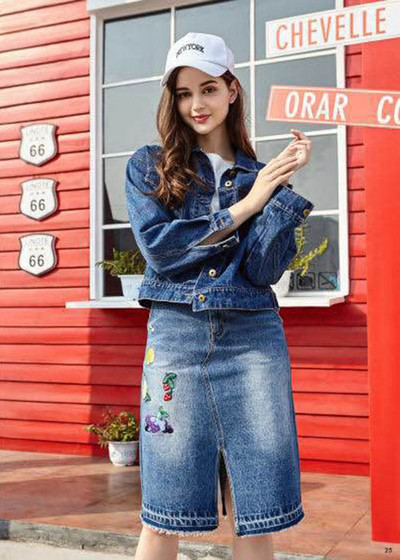 套装对于懒人一族来说是***的福利,不用纠结怎么搭配,在造型上又非常好看。这款外套+半身裙的牛仔套装显瘦显高,还很时尚哦!上身超短款的牛仔外套采用夹克的造型,加上衣摆收缩的设计即使是小个子女生也能轻易how住,下身印花半身裙,裙身右侧的绣花增加了裙子的精致感,前裙摆的开叉设计更是显得很有有女人味。