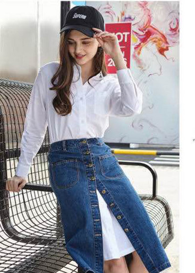 牛仔半身裙一直是小编的***单品,无论是包臀的还是A字版型的,都非常易搭配,而这款中长款的牛仔半身裙较之普通的牛仔裙更加时尚好看,中长款的高腰版型显高显瘦,前排扣子方便穿着,也增肌了时尚感。与白色衬衫裙叠穿无论是配色还是搭配的技巧上都是***的,这样的穿搭必会成为今年的流行穿搭。