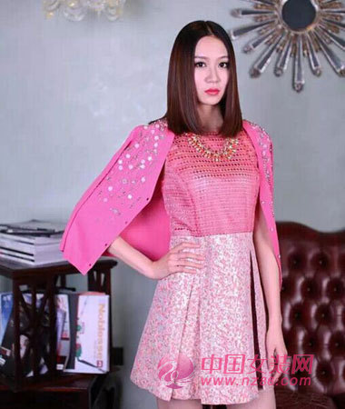 甜美粉网格透视拼接高级提花面料连衣裙,搭配Jessica***设计款宝石珠链,雍容华贵感立现。